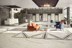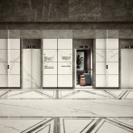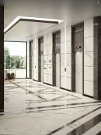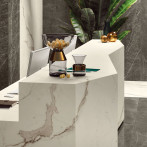 The Calacatta Prestigio series features porcelain stoneware slabs with an elegant white marble effect, making them ideal for sophisticated spaces. Available in 162x324 cm and 160x320 cm sizes, with 12 mm and 6 mm thickness options, and polished and silk surface finishes, these slabs offer aesthetic continuity through the bookmatch option. They are particularly suitable for wall cladding, reception desks, tables, and countertops in business and hospitality environments.