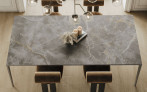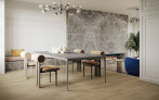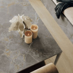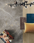 Fior di Bosco is a large-format porcelain slab by Atlas Plan, featuring a gray marble look. With a sophisticated combination of deep gray tones and golden veining, this series offers an elegant atmosphere suitable for both modern and classic spaces. Available in 162x324 cm size with 6 mm and 12 mm thickness options, Fior di Bosco adds a rich touch to spaces with its polished and silk surface finishes. It is ideal for kitchen islands and bathroom vanities.