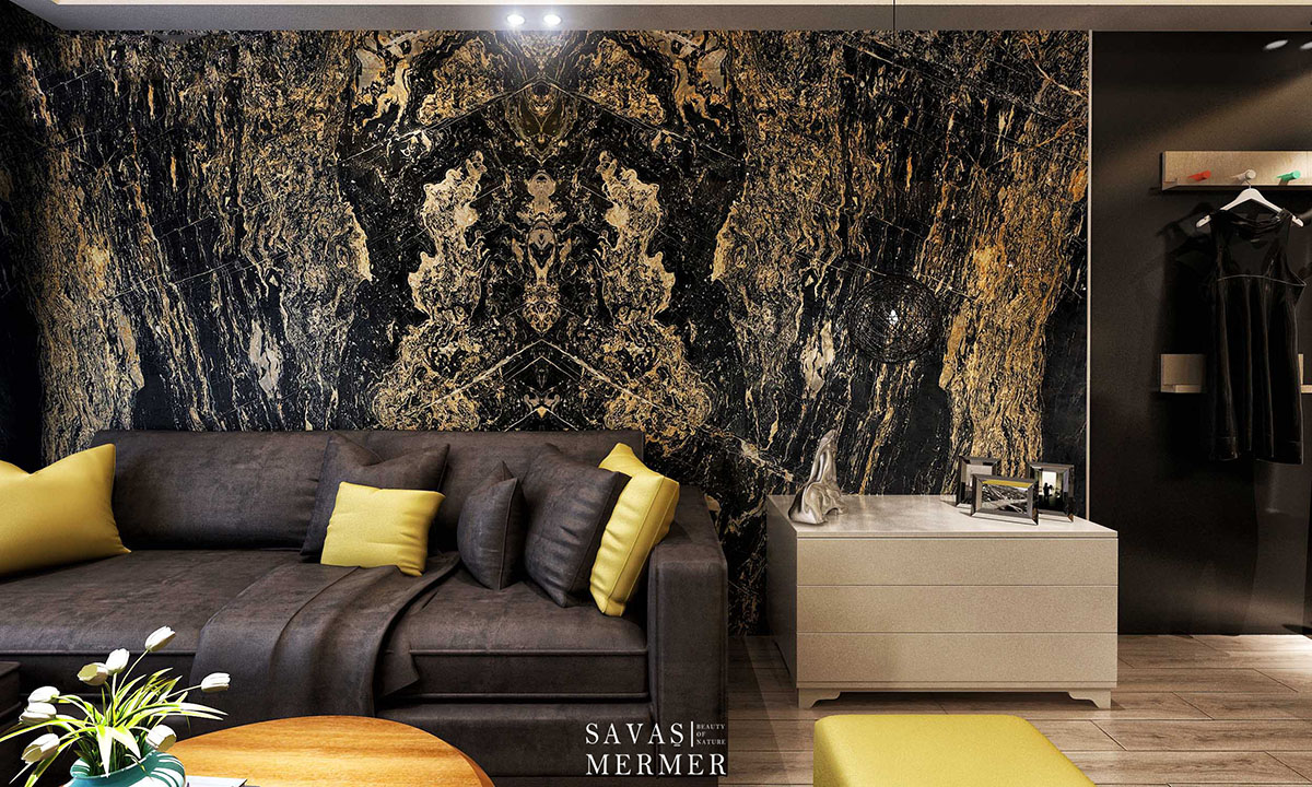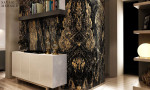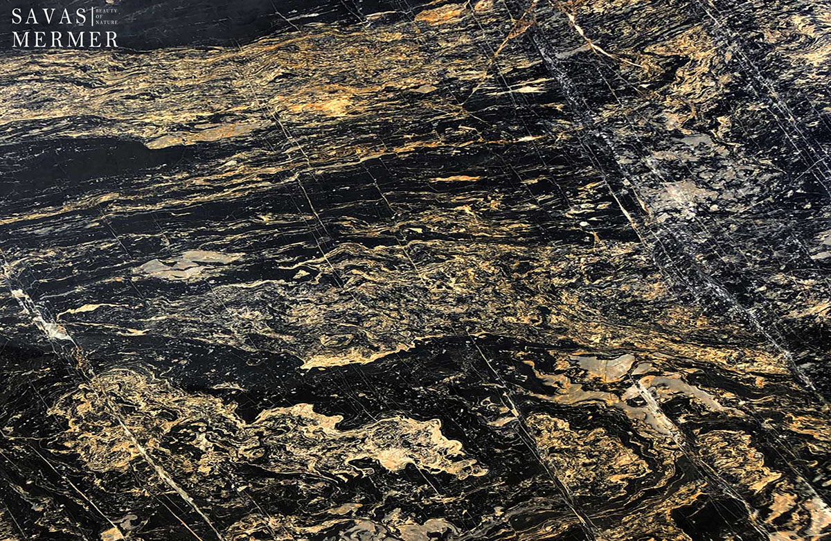El Mármol Nero Picasso presenta un intenso fondo negro con vetas blancas y doradas, ofreciendo un aspecto lujoso y distintivo. Ideal para interiores modernos y clásicos.