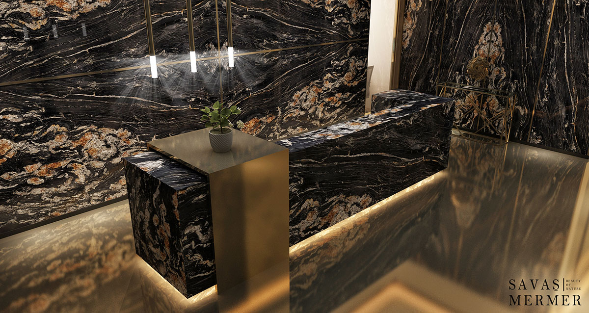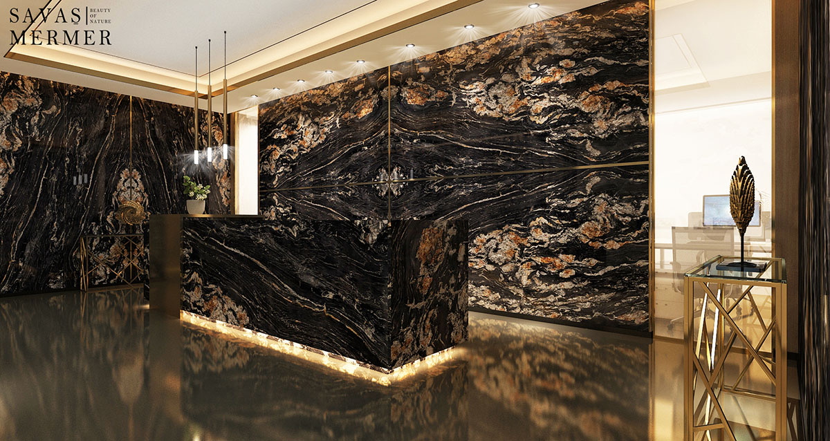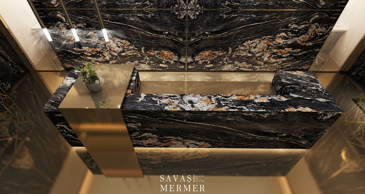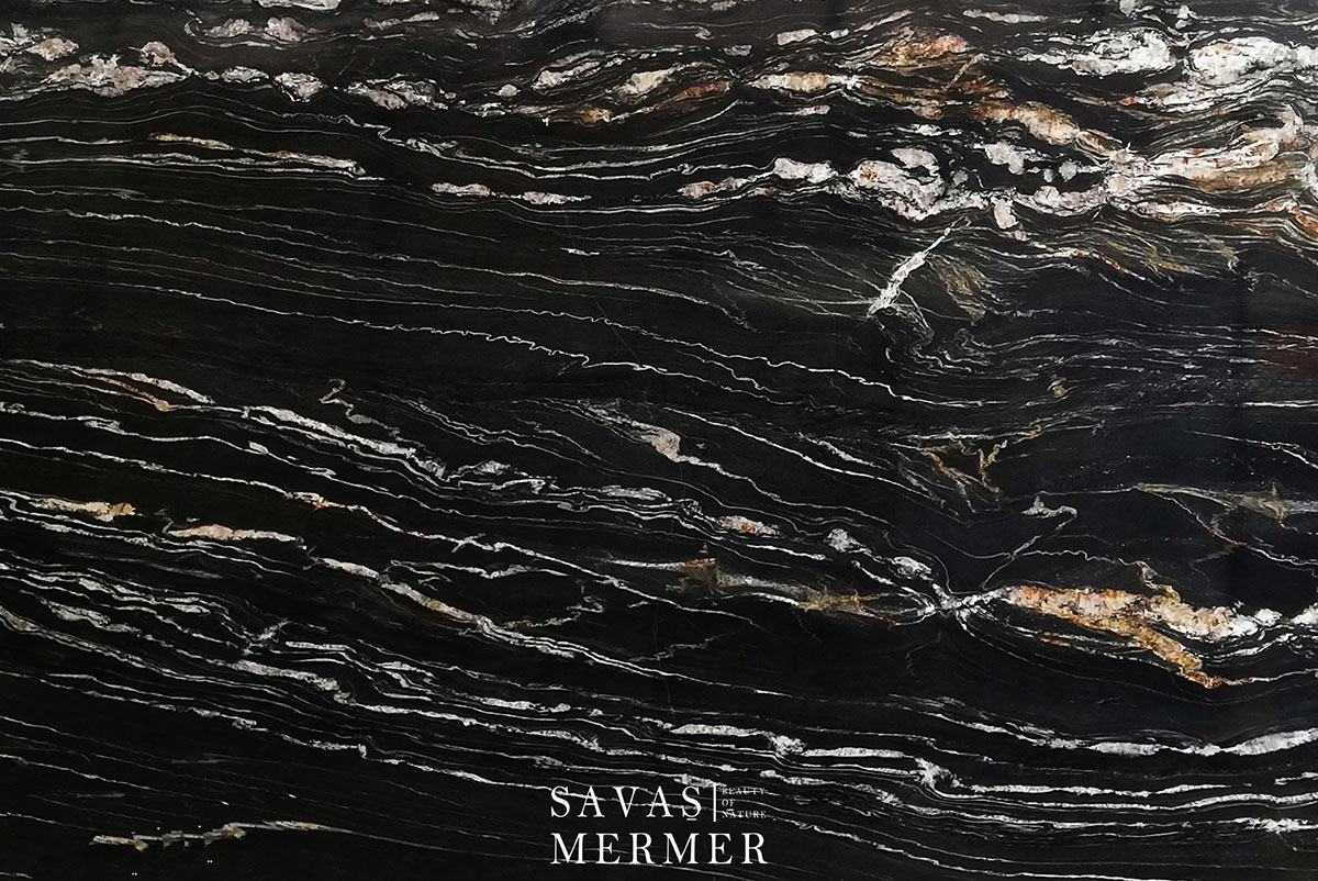 La Cuarcita Tropical Storm es una piedra natural impresionante con fondo negro profundo y vetas doradas, blancas y plateadas. Sus patrones dinámicos evocan la energía de una tormenta, perfecta para interiores modernos y de lujo.
